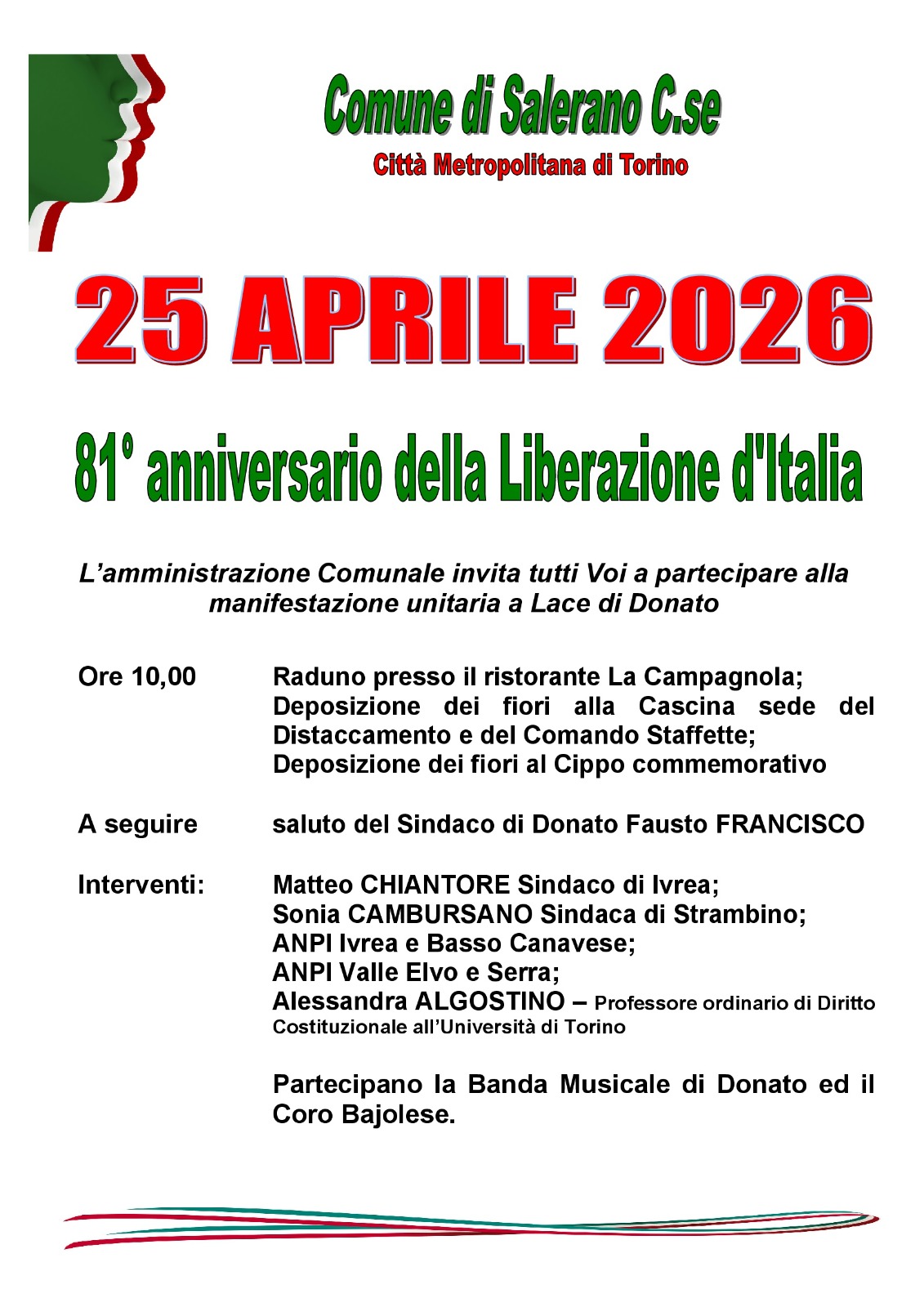 In occasione della ricorrenza del 25 Aprile l'Amministrazione comunale invita i cittadini a partecipare al raduno commemorativo che si terrà nella mattinata a Lace di Donato.