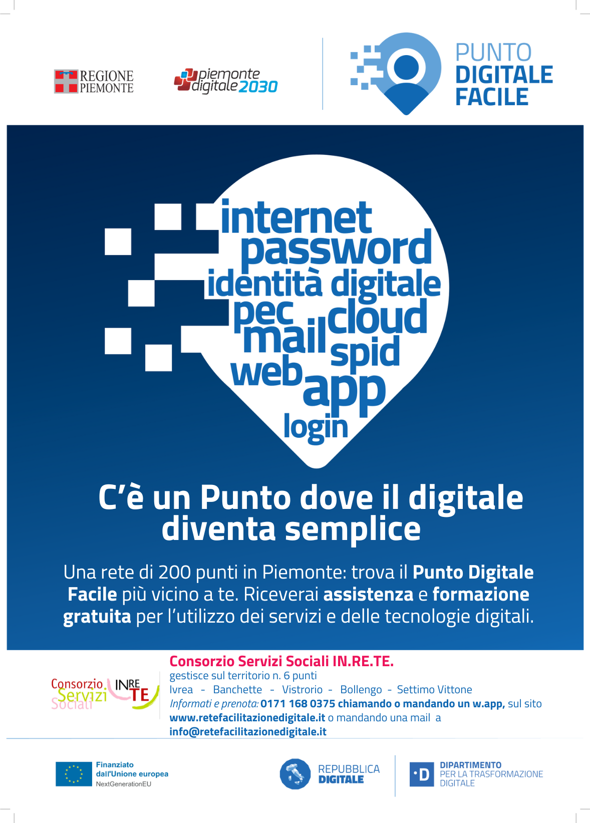 Il Consorzio IN.RE.TE., in qualità di soggetto sub-attuatore, partecipa al bando della Regione Piemonte: "Bando regionale non competitivo per l'attuazione della Misura 1.7.2. del PNRR: costituzione di reti locali di facilitazione digitale" finanziato dal Ministero per la Transizione Digitale nell'ambito della "Misura 1.7.2 del PNRR per la Transizione Digitale".