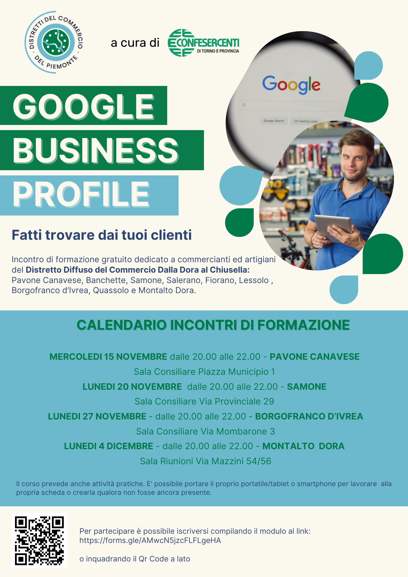 I Comuni del Distretto "Dalla Dora al Chiusella", in collaborazione con Confesercenti di Torino e Provincia, organizzano un nuovo ciclo di incontri formativi gratuiti rivolto ai propri commercianti e artigiani, dal titolo "Google Business Profile".