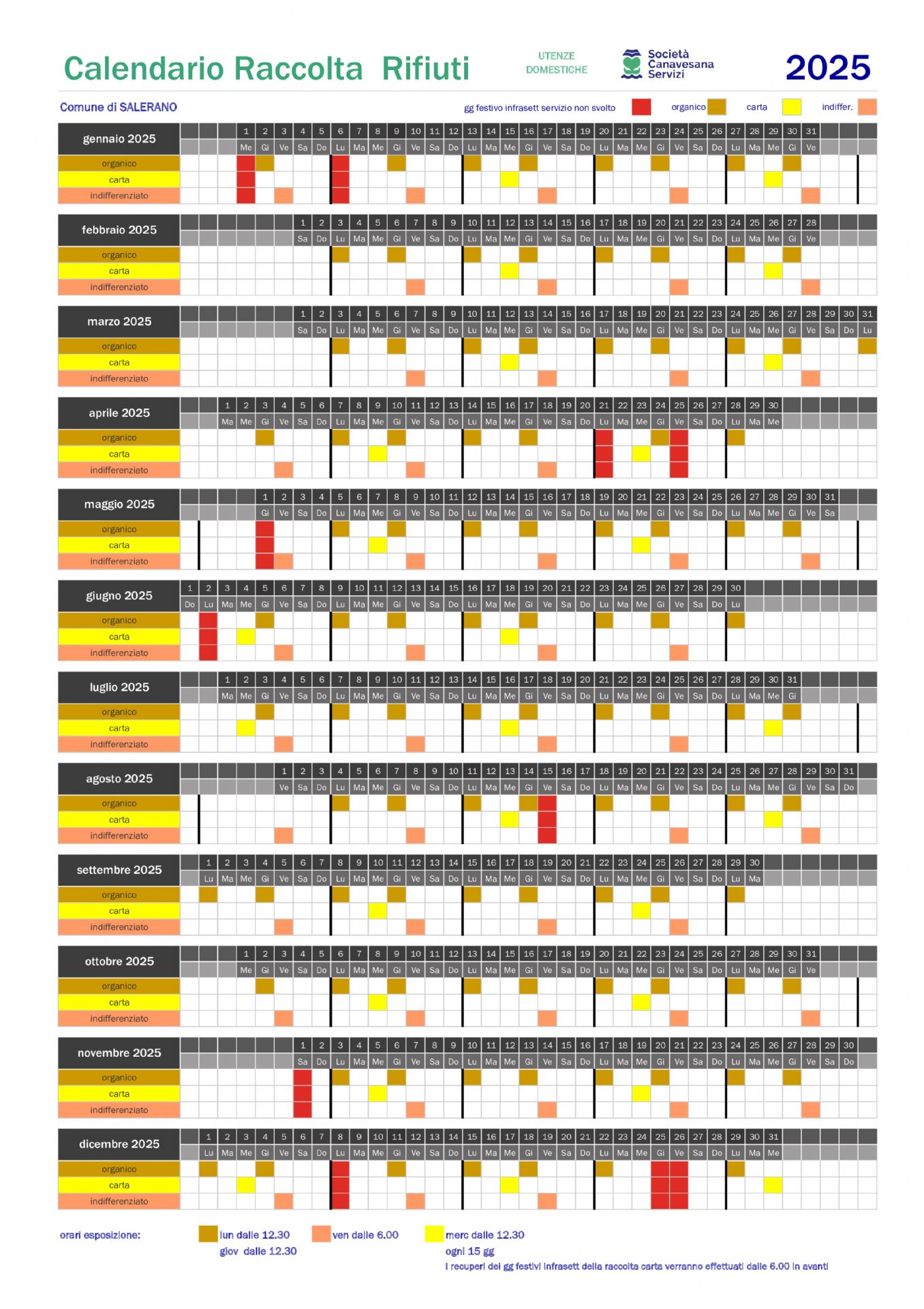 Pubblichiamo il nuovo calendario di raccolta dei rifiuti pervenuto da Società Canavesana Servizi per l'anno 2025 per le utenza domestiche.