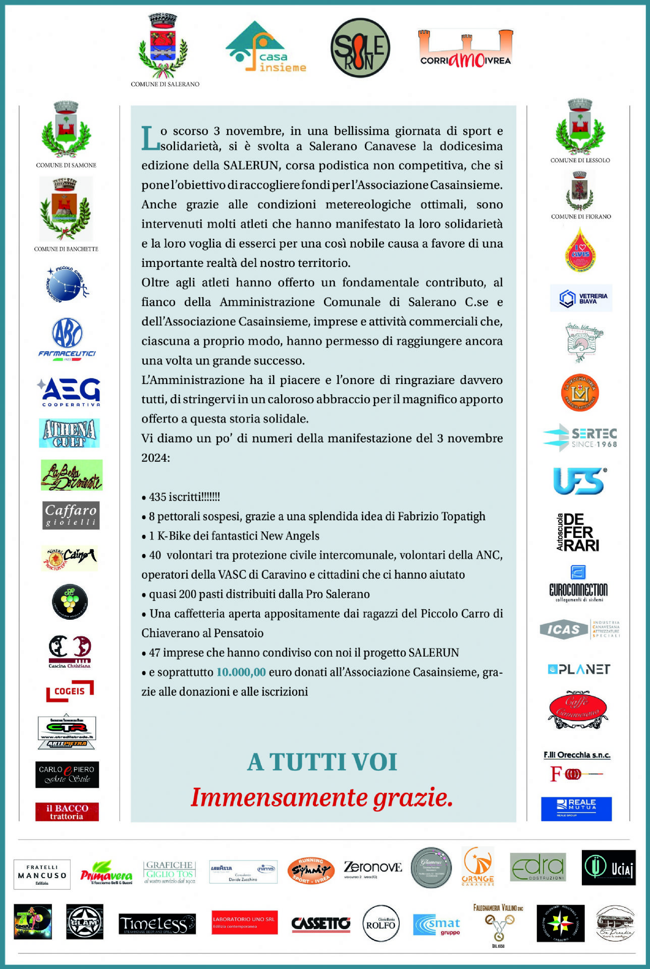 • e soprattutto 10.000,00 euro donati all’Associazione Casainsieme, grazie alle donazioni e alle iscrizioni.
