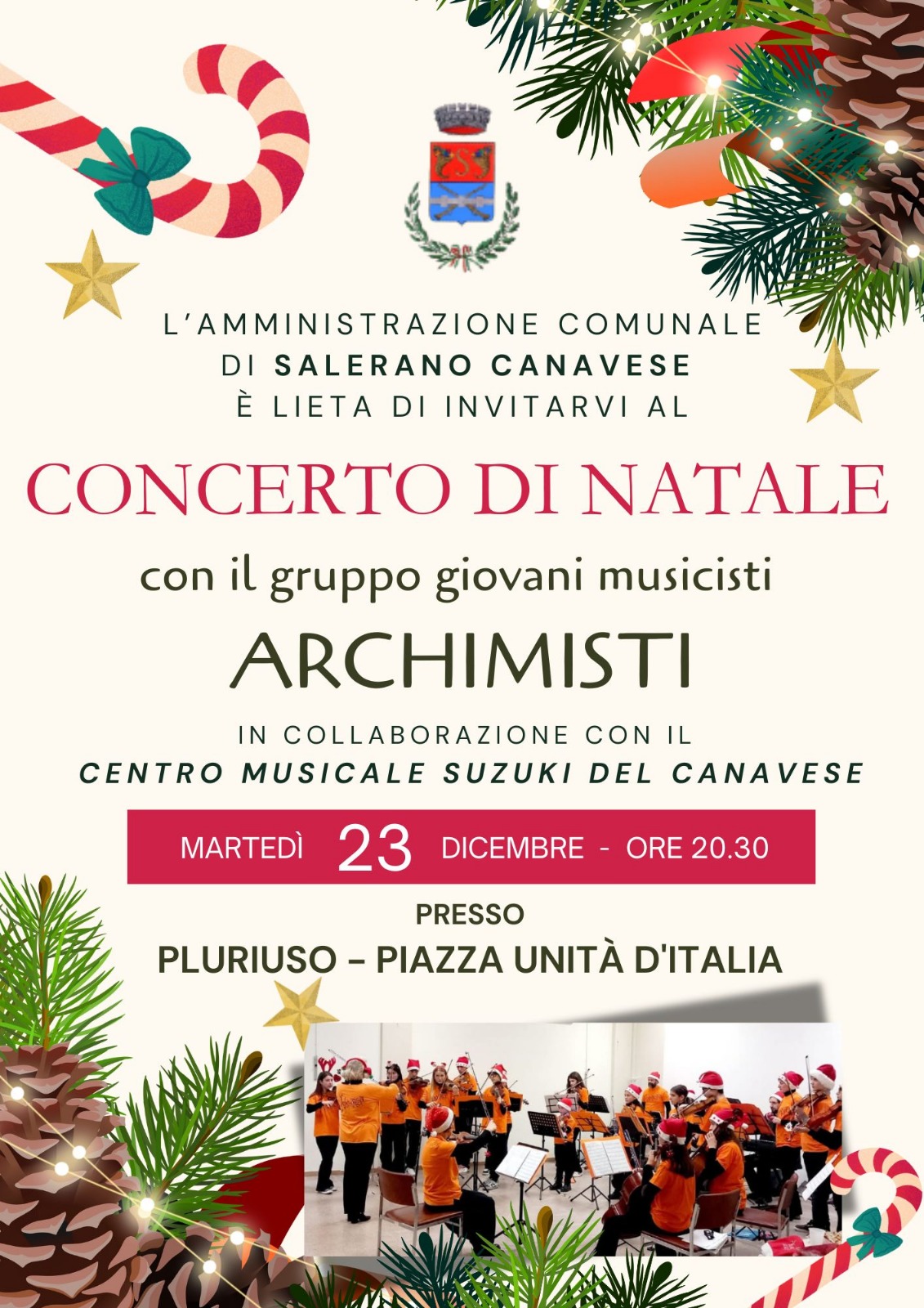 Martedì 23 dicembre alle ore 20:30 presso il salone pluriuso del Comune di Salerano Canavese, con accesso da via Mercanda, si svolgerà il Concerto di Natale con il gruppo giovani musicisti "Archimisti" in collaborazione con il centro musicale Suzuki.