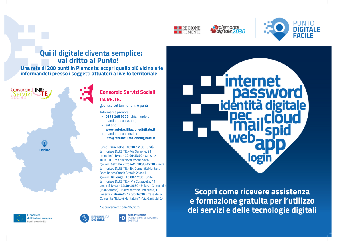 Il Consorzio IN.RE.TE., in qualità di soggetto sub-attuatore, partecipa al bando della Regione Piemonte: "Bando regionale non competitivo per l'attuazione della Misura 1.7.2. del PNRR: costituzione di reti locali di facilitazione digitale" finanziato dal Ministero per la Transizione Digitale nell'ambito della "Misura 1.7.2 del PNRR per la Transizione Digitale".